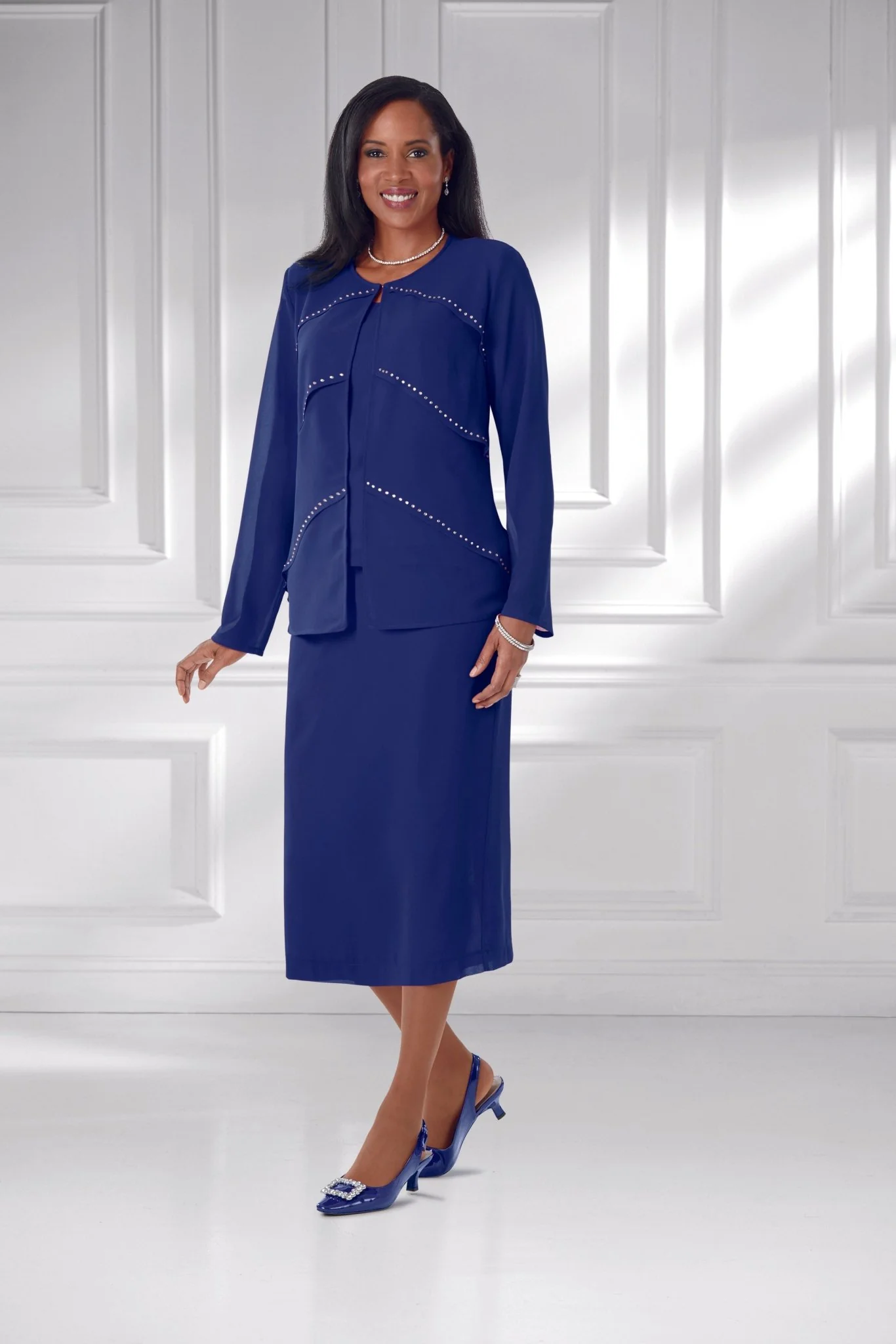 New Angle Tiered Suit by EY Boutique — The flow of georgette, the glow of tiered rhinestones. Beautiful, lightweight and breathable, this ensemble is simply a joy to wear. Jacket: angled embellishments add visual interest. Hidden hook-and-eye closure. Full tank. Matching skirt: classic straight silhouette. Back slit lets you move with ease. Our formal church suits for ladies are impeccably designed for divine elegance, grace and all-day comfort. Modern church attire is ideal for worship, weddings, social events and many other special occasions. Elevate your Sunday Best with this inspirational style from our exclusive collection of Especially Yours church suits. At EY, we are committed to offering African American women the best in high-quality fashions at affordable prices. Especially Yours clothing offers Black women so many ways to express their beauty, heritage and faith. Love it? Simply click “Add to Cart”.