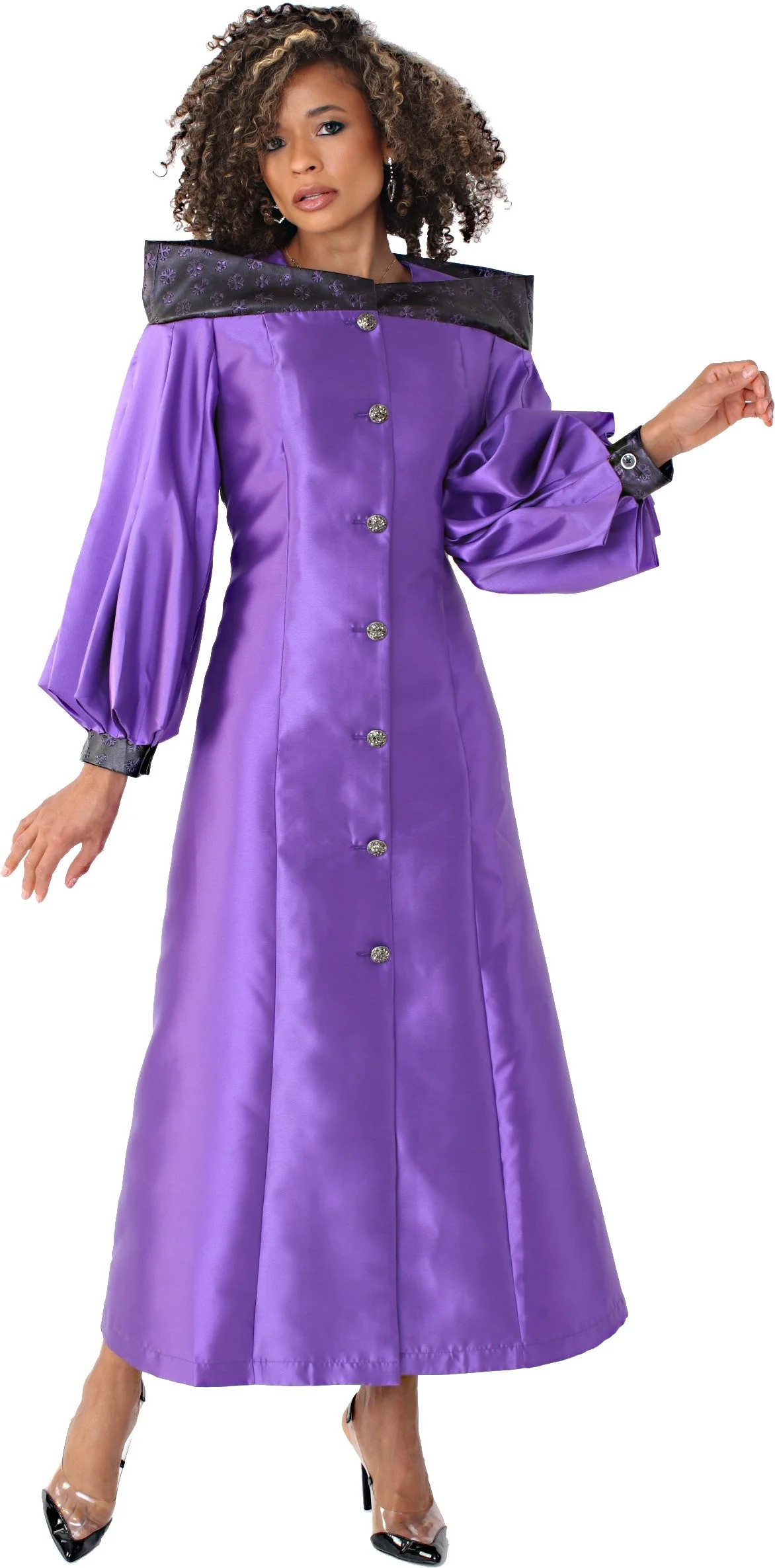 Celebrate elegance and tradition with our one piece cassock robe, designed for church services, clergy, and choir performances. Made from a shiny silk-like fabric, it features a contrasting collar, fluted bishop sleeves, and jeweled buttons for a polished, graceful look. Available in classic black, pristine white, and regal purple, this timeless robe offers a flattering fit and refined style, whether you're seeking a traditional black choir robe or a standout piece for special occasions.